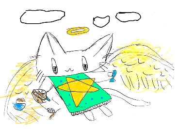 | ポムは、すてネコです。みかんのはこにのって川を流れていました。 「これから、どうなるのかな。いい人に拾ってもらえるかな。とても悲しいな。天使になれたらいいのに…。」 前をよく見ると滝です。小さな滝でもこの箱はこわれてしまいます。 「助けて!」 ポムは目をつぶって、かみさまにお祈りしました。 気がつくとポムには羽がありました。かみさまが天使にしてくれたのです。ポムは、かみさまにお礼がしたくてたまりません。でも、かみさまは、いそがしくて会うことはできないのです。 ポムは地上に種をまきました。やがて種はたちまち芽をだし根をのばし、花をつけて、実ができました。実ったのは、ネコたちが大好きな魚や肉です。地上にかわいそうなネコがふえないように、かみさまが、あんまりいそがしくならないように、ポムがまいたのはネコの食べ物になる木でした。 仲間の、いえ、世界中のネコがよろこび、とても仲良しになりました。 |